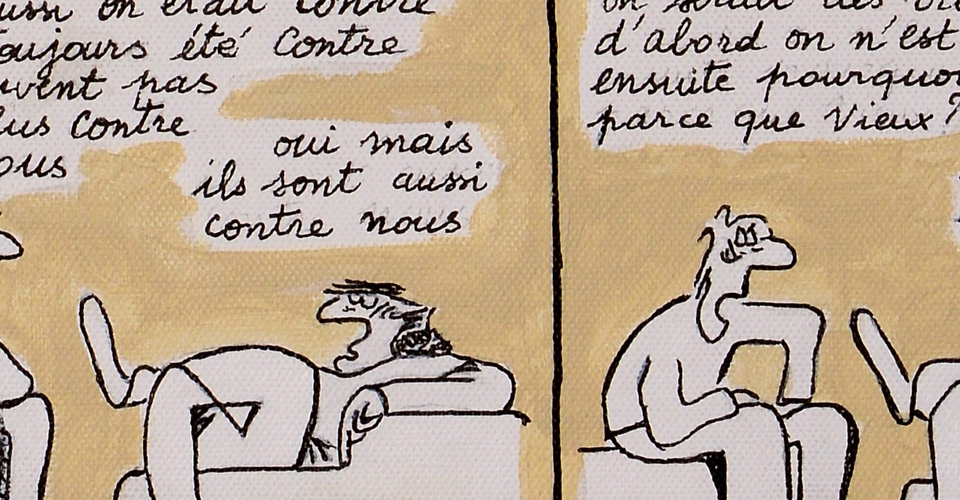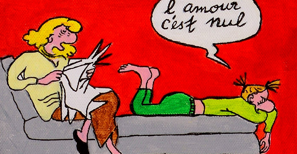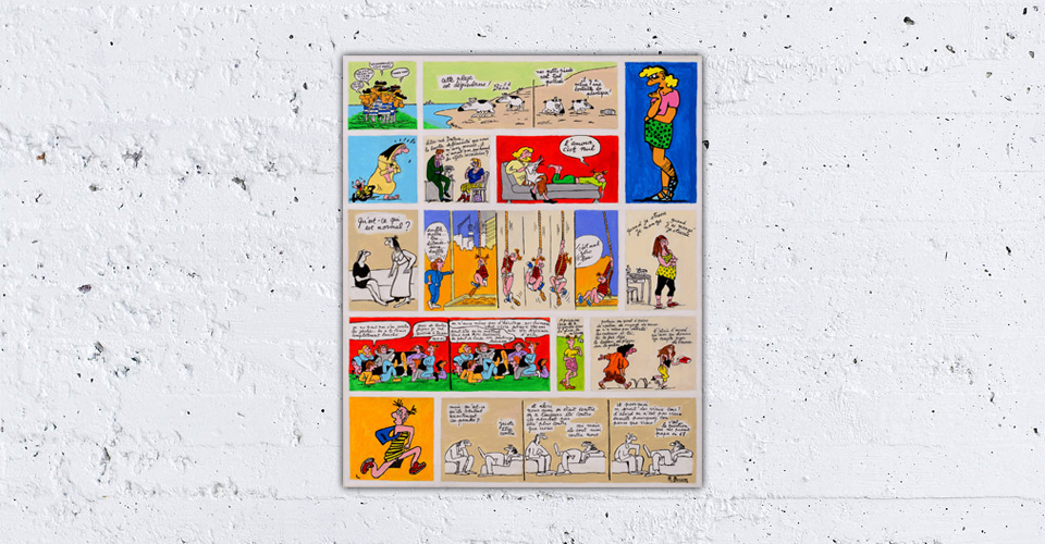 Acrylique sur toile 65x54cm 2015/2016 Bibliothèque Centre Pompidou en savoir + Expo «Claire Bretécher» Bretécher en Clair Morceaux choisis de l'œuvre dessinée de Claire Bretécher, qui regorgent d'histoires courtes, d'une actualité fascinante et encore en avance sur notre temps.